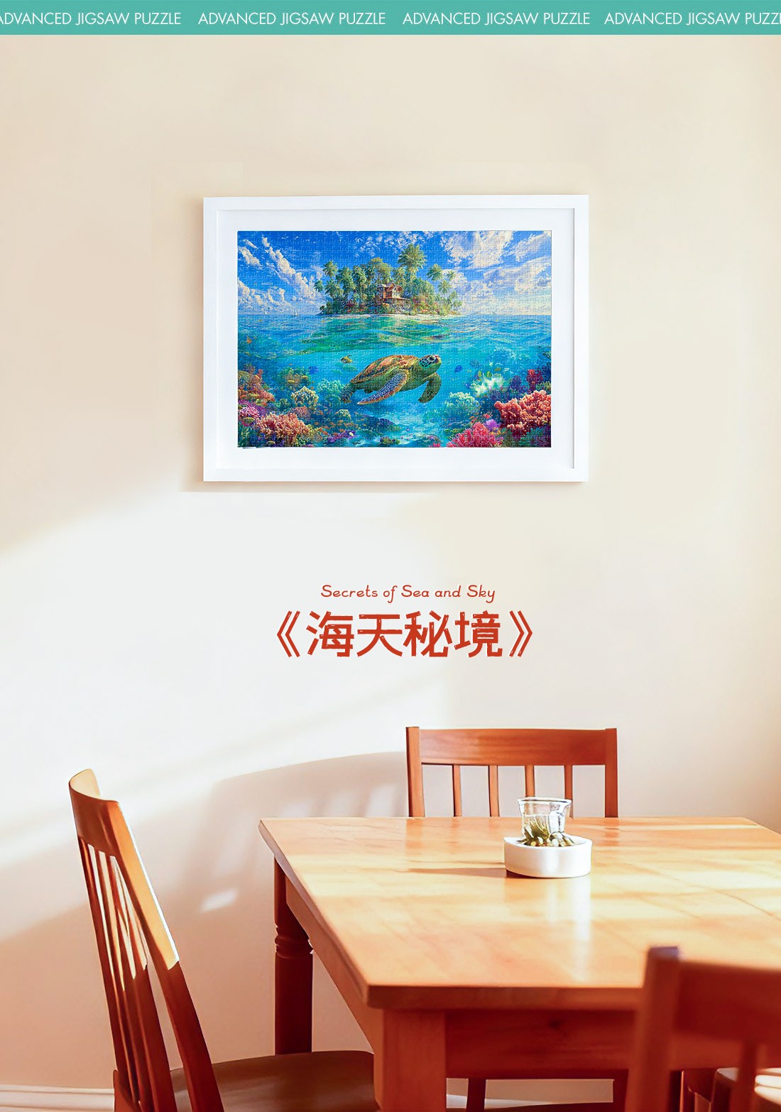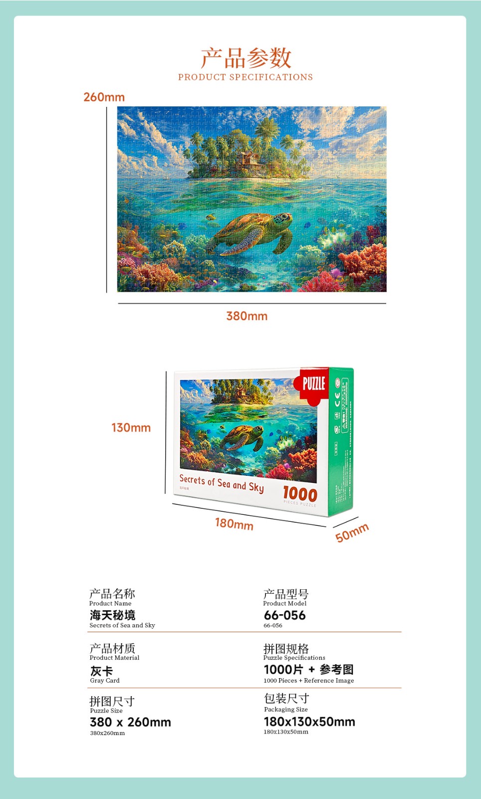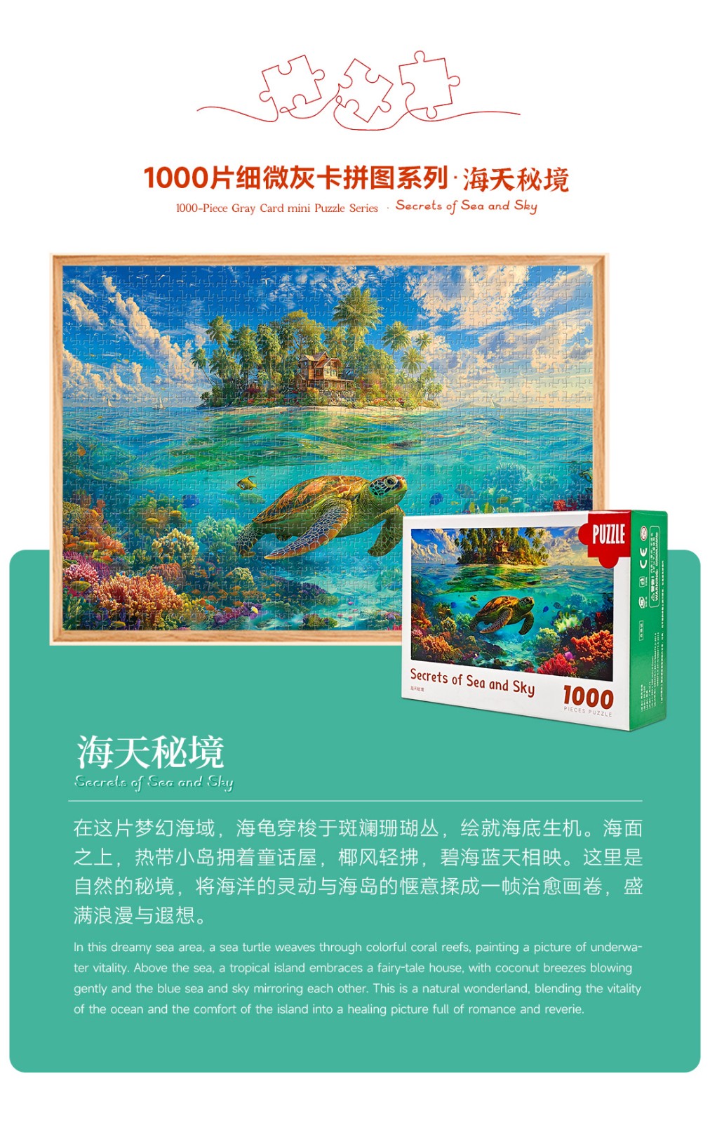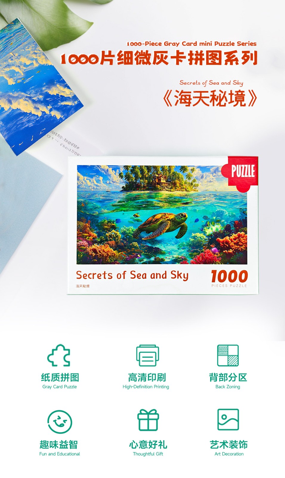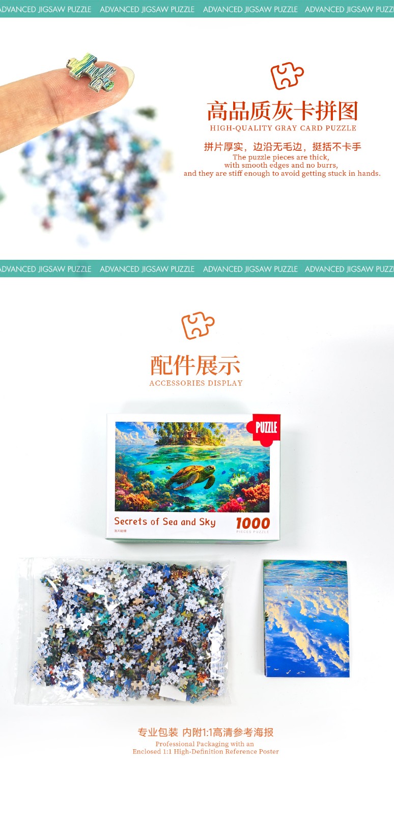 拼圖名稱:海天秘境 拼圖尺寸:380*260MM 拼圖片數(shù):細微灰卡1000片 加工方式:廠規(guī)、來圖定制 包裝尺寸:180*130*50mm