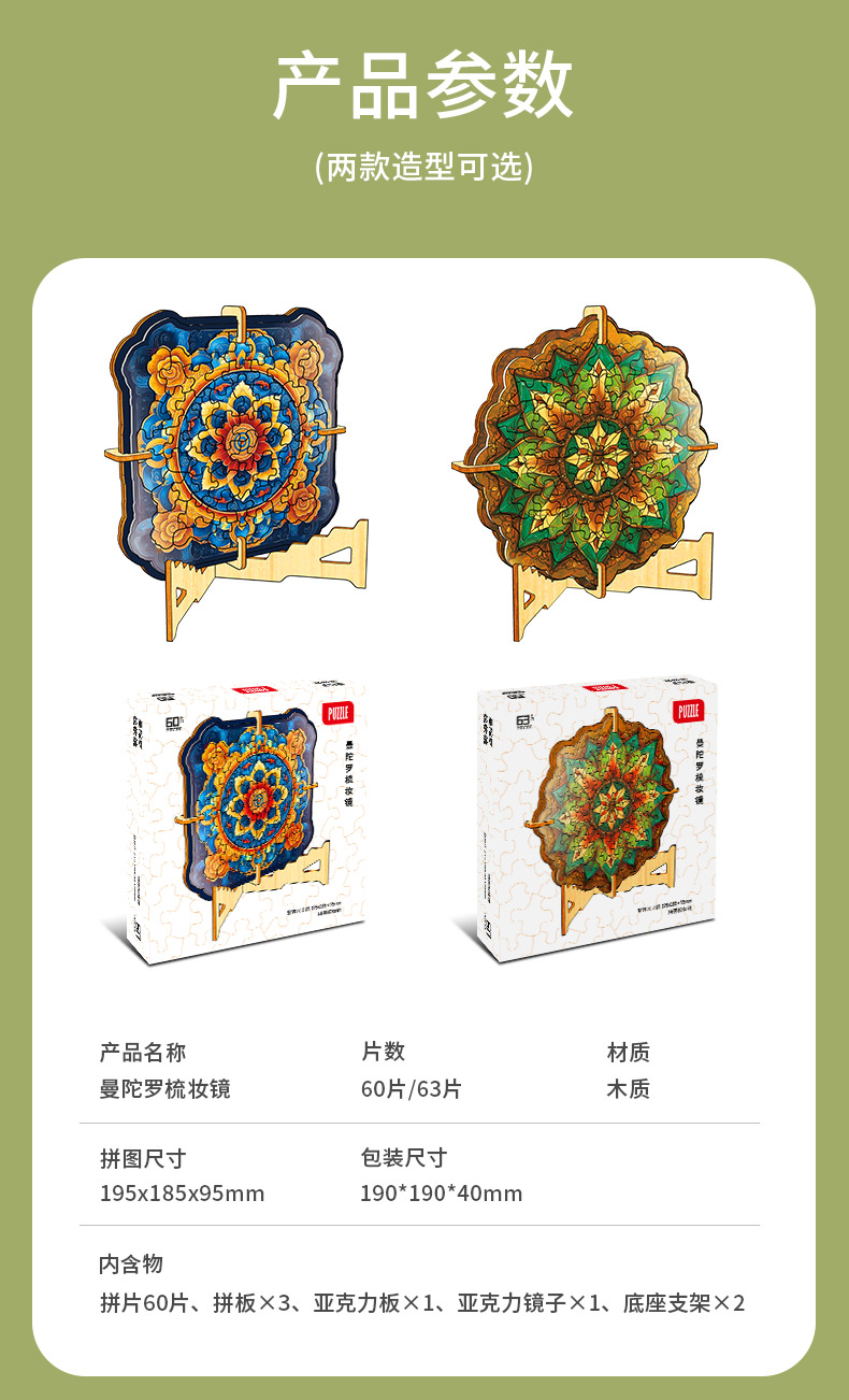拼圖名稱:曼陀羅梳妝鏡拼圖 材質(zhì):木質(zhì) 拼圖尺寸:195*185*95mm 拼圖片數(shù):60/63片木質(zhì) 加工方式:廠規(guī)、來圖定制 包裝尺寸:190*190*40mm